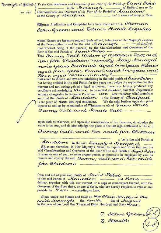 1863, 10 August: Removal Order signed by Bedford St Peter's Overseers to send Fanny and 5 children (Mary Ann, Frederick, Harriet, Susan & Rose) back to her home village of Maulden, near Hitchen. | |