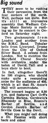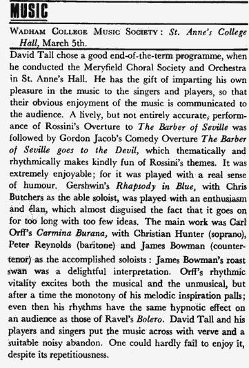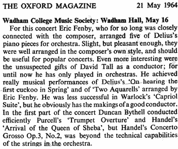 During Eric Fenbys visit I spent time with him, walking vigorously through Christchurch Meadows. I mentioned my possibile interest in a musical career. He counselled against this, telling me that I had the pleasure of music as a hobby and the security of a future position at a university. He told me of his own struggle in his musical life and I resolved to build my future round an academic career with music ever-present through amateur choirs and orchestras. My experience in conducting grew in my remaining two years at Oxford. I became conductor of the Wadham-Lady Margaret Hall Choir for a performance of Brittens Ceremony of Carols with harp in the autumn of 1964. I then formed the Meryfeild Choral Society (Meryfeild is the village where our college founder, Dorothy Wadham, had been raised. We tried to spell it Meryfeild, as in an ancient text, but everyone read it as Meryfield and we eventually fell in with the natural interpretation.) The choir grew concert by concert. There were sixteen singers in the Wadham LMH choir at Christmas, 1964. Four left, but twenty joined, so that 32 performed the Kodaly Missa Brevis and Brittens St Nicholas in the inaugural concert in the spring of 1965. The choir also performed a Missa Brevis I wrote for choir and harp. In the summer term, 40 singers took part in the Beethoven Mass in C. It was a good performance, but, for the first time, I realised I did not have the same magic that Lazlo Heltay had generated. It taught me that whatever I am, I must be myself. At the same time I was conducting orchestral concerts, including one with the Schumann Piano Concerto, Fauré Pelleas et Melisande and the Haydn London Symphony and another including Mozarts Concerto for Violin and Orchestra K216 and his 29th Symphony. I was enjoying conducting by now, despite Eric Fenbys suggestion that I should control, not enjoy. A small incident reminded me to stay on track. There is a notorious exposed horn entry in the Mozart Concerto which seemed to provoke the horns to freeze in rehearsal. To relax them I used to do crazy things like pulling a face each time we practiced until (I thought) nothing could possibly go wrong. At the concert, I conducted it straight. The horns fell about laughing and failed to come in. In the autumn of 1965 the sixty-strong Meryfield Choral Society, and the Wadham College Orchestra performed the Mozart Requiem together with the Elgar Cello Concerto with Dietrich Bethge as soloist. It was a moving experience. Robin Drummond-Hay wrote as follows in the Oxford Gazette: Horace Fitzpatrick (in the Oxford Mail) wrote: