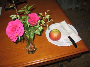 ![]() ... the apple that David had taken from the breakfast buffet for a later snack had been given special attention by the maid, placing it on a plate with a napkin and knife. |