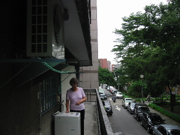 ![]() Our balcony with its outdoor washing machine. Click here to see a panorama to the right of this view. |