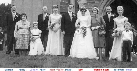 | Sue and David's wedding with, left-to-right, David's brother Graham, Mum Nancy, cousin Jocelyn, Dad Harry, Jean Frogley (Sue's Schoolfriend), David, Sue, Sue's mum Monica, her father Spen, David's sister Rosemary, cousin Peter. In the background on the right is Melvyn Round, in the background on the right, cousin Michael. |