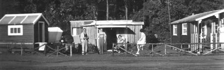 | The Nichols family built three bungalows at Overstone Solarium in the late thirties to use in their holidays, Nancy had the bungalow on the left of the picture, her parents Frank and Lillian in the middle, and brother Bill on the right. Later, (see colour photo), Nancy and Harry put two single room bungalows together, with Harry's brother Reg doing the carpentry, to build a bungalow with living room, bedroom (bunk beds for the boys, single bed for Rosey and double bed for Nancy and Harry), and kitchen with calor gas cooking stove. |