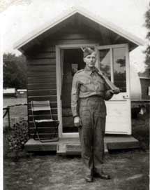| Dad in his soldier's uniform in front of Mum's bungalow. This was a single room. To the right Dad built another bungalow in which he kept his canaries. Later, Uncle Reg came over and joined the two together, adding a kitchen and a shed. David well remembers this, so it must have been in the late 40s early 50s. A later, colour picture of all the bungalows in their final form is found in Nan Nichols folder. |